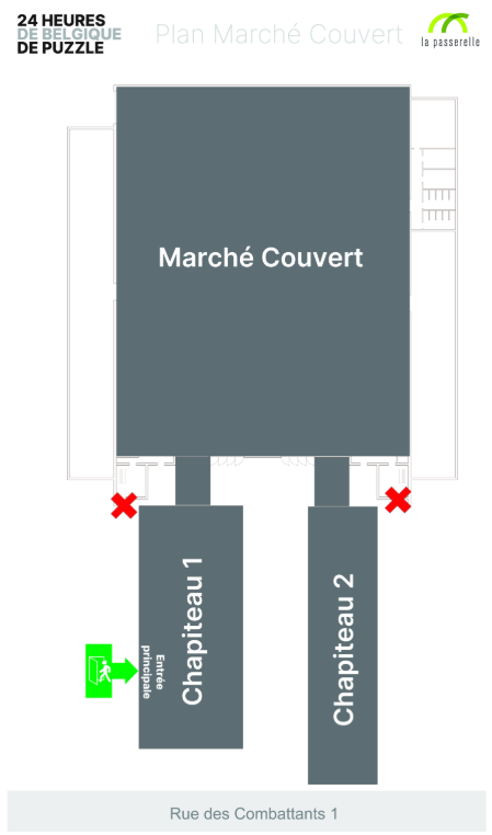 Attention que l’entrée dans le Marché Couvert se fera cette année par l’entrée latérale du chapiteau 1, càd celui qui se trouve à votre gauche quand vous faites face au Marché Couvert…